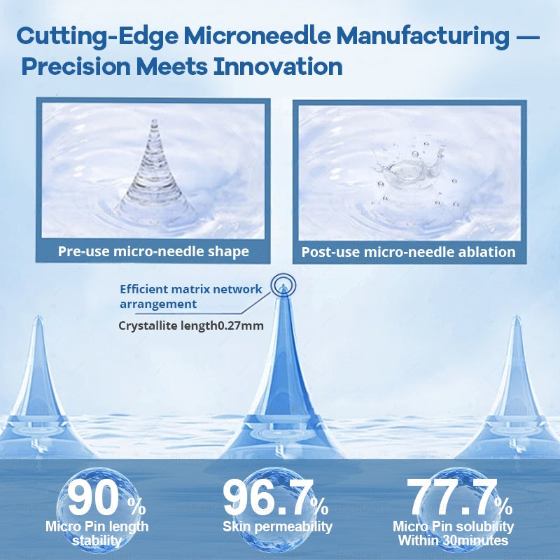 Each needle is 0.27mm long, just 1/7th the thickness of a hair, and is made from dissolvable medication. These micro-needles are precision-engineered using cutting-edge manufacturing techniques to ensure a seamless, pain-free experience while effectively delivering the active ingredients directly into the skin.